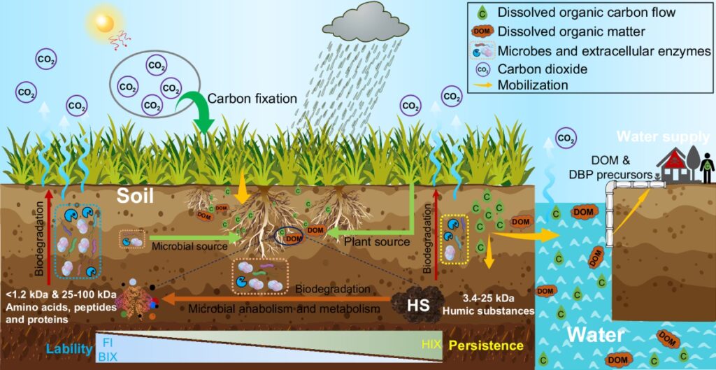 Por otro lado, las prácticas agrícolas pueden modificar profundamente la conexión física entre el suelo y el agua. El arado y la labranza alteran la estructura del suelo, rompiendo los agregados que protegen la materia orgánica. Esto, combinado con la falta de una cubierta vegetal permanente en ciertas épocas del año, hace que el suelo sea mucho más vulnerable a la erosión por el viento y el agua. Como resultado, grandes cantidades de materia orgánica del suelo (SOM) son arrastradas hacia los cursos de agua. Esta es una inyección masiva de MOD alóctona, rica en compuestos húmicos y de alta complejidad estructural. Además, los sistemas de drenaje artificial, comunes en la agricultura, pueden acelerar el transporte de esta materia orgánica disuelta desde el subsuelo hasta los arroyos.