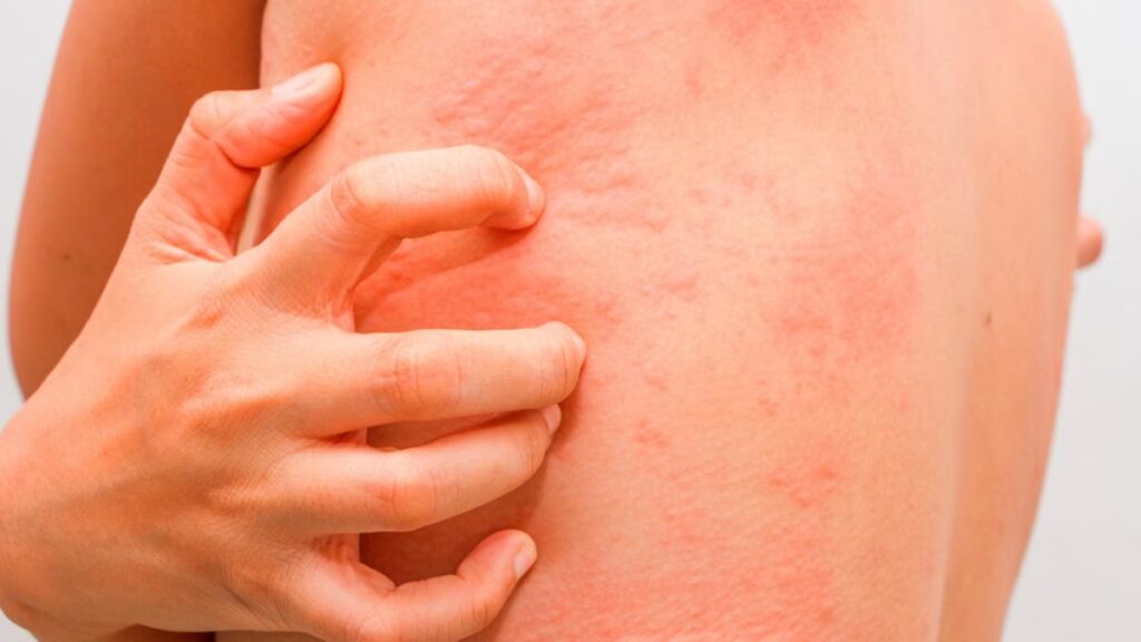- Erupciones cutáneas: Pequeñas ronchas o pápulas rojas de 1 a 3 mm que aparecen en las zonas de la piel que han estado en contacto con el agua. Las áreas más comunes son el cuello, el pecho, la espalda, los brazos y el abdomen. Curiosamente, las palmas de las manos y las plantas de los pies rara vez se ven afectadas.