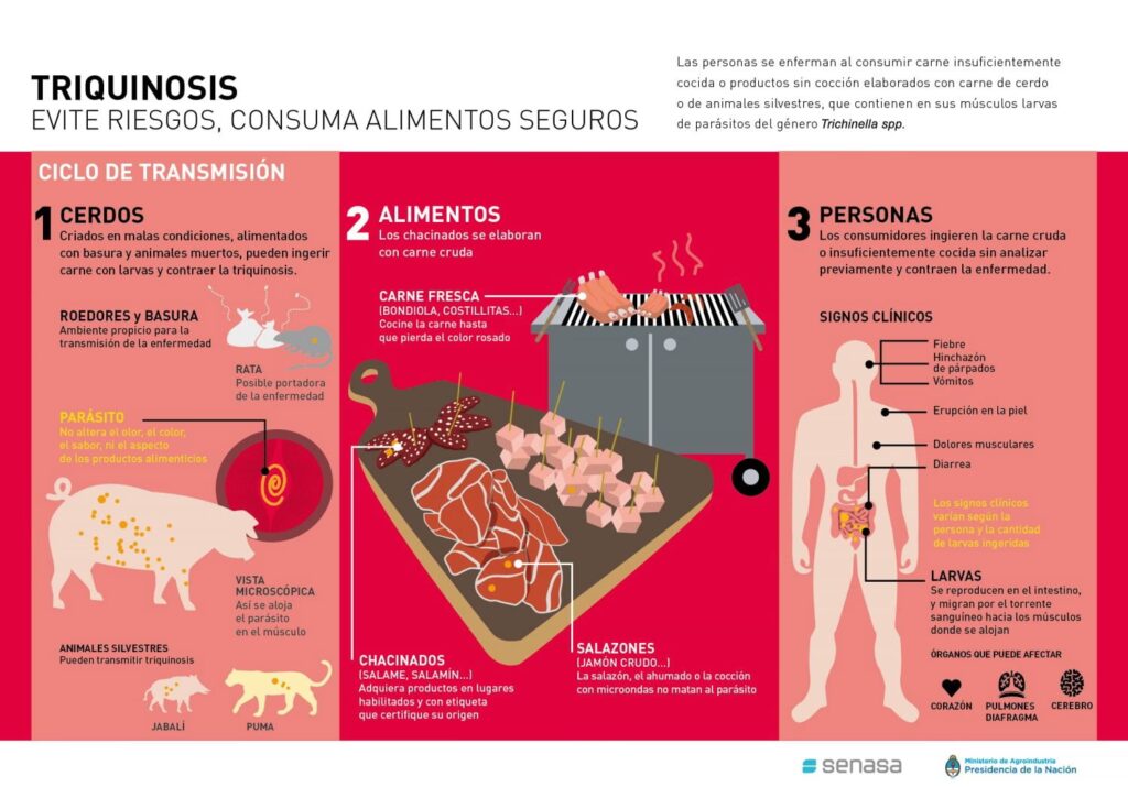 - Transmisión al Humano: El ciclo llega al ser humano cuando una persona consume productos o subproductos cárnicos (como chorizos, salames, jamón crudo o carne fresca) de un animal infectado que no han sido cocinados adecuadamente. El proceso se repite entonces dentro del cuerpo humano, causando la enfermedad.