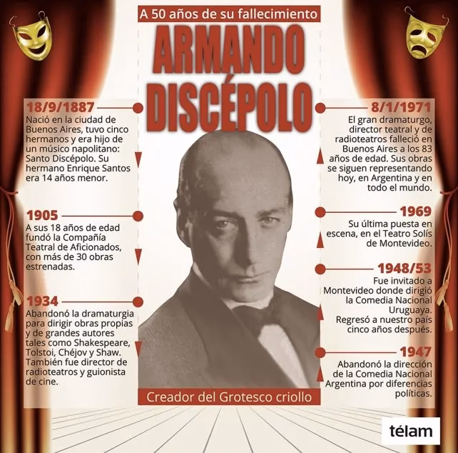 Nacido en Buenos Aires en 1887, Armando Discépolo creció en un hogar donde el arte era el pan de cada día. Su padre, Enrique Santos Discépolo, fue un inmigrante napolitano que dirigió la primera Banda Municipal de la ciudad, y su hermano menor, Enrique Santos, se convertiría en "Discepolín", uno de los más grandes poetas y compositores de la historia del tango. Este caldo de cultivo artístico encendió en el joven Armando una pasión irrefrenable por el teatro. La vocación se convirtió en profesión a los 18 años, tras la muerte de su padre, cuando decidió dedicarse por completo a las tablas.