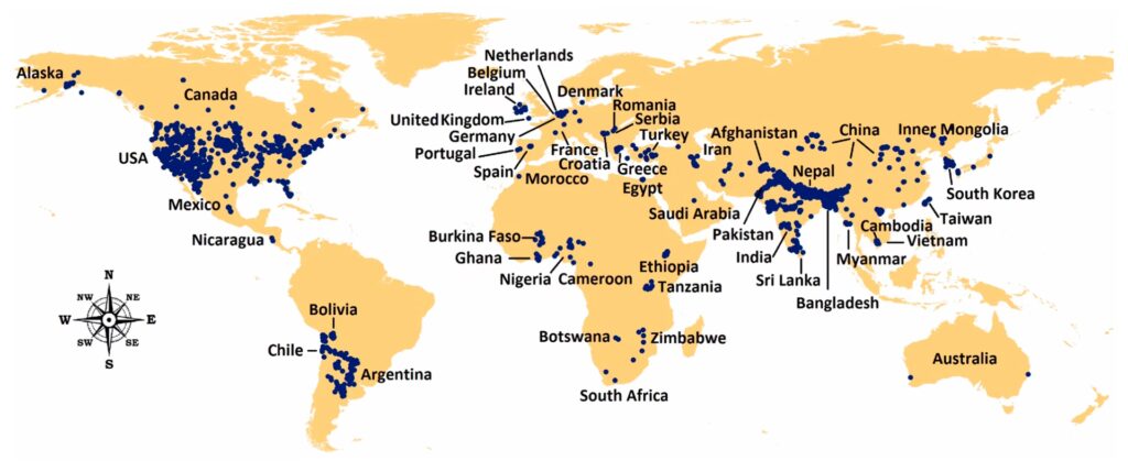 Durante la última década, el número de regiones afectadas por la contaminación con arsénico ha aumentado significativamente. Se estima que 108 países tienen problemas de arsénico en sus aguas subterráneas, siendo Asia (32 países) y Europa (31 países) los continentes con más naciones afectadas. De los 230 millones de personas en riesgo, 180 millones viven en Asia. Países como Bangladesh, India, Pakistán, China, Nepal y Vietnam se enfrentan a una crisis de salud pública de enormes proporciones.