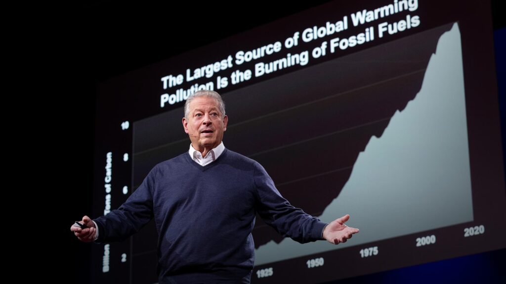 (Mostrando un gráfico de barras) "Como pueden ver en esta diapositiva, las emisiones de CO2 han aumentado un 40% desde la era preindustrial.""Respiren hondo. Ahora, imaginen que con cada exhalación, liberan una pequeña nube de calor que se queda atrapada en la atmósfera. Multipliquen eso por 8 mil millones de personas. De eso quiero hablarles hoy."