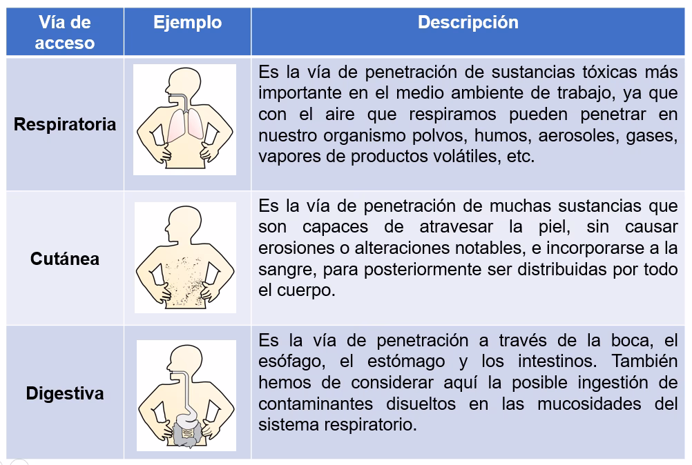 Son quizás los más conocidos. Se trata de materia orgánica o inorgánica, natural o sintética, que puede presentarse en diversos estados. Su presencia en el aire, en forma de polvo, humo, gas o vapor, puede ser inhalada, mientras que en estado líquido puede ser absorbida por la piel o ingerida accidentalmente. Ejemplos comunes incluyen: