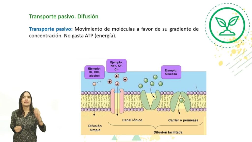 El transporte pasivo es el movimiento de sustancias a través de la membrana a favor de su gradiente de concentración, es decir, desde una zona donde están más concentradas hacia una donde lo están menos. Este proceso no requiere que la célula gaste energía (ATP) y es similar a cómo una gota de tinta se expande en un vaso de agua por sí sola. Existen tres modalidades principales: