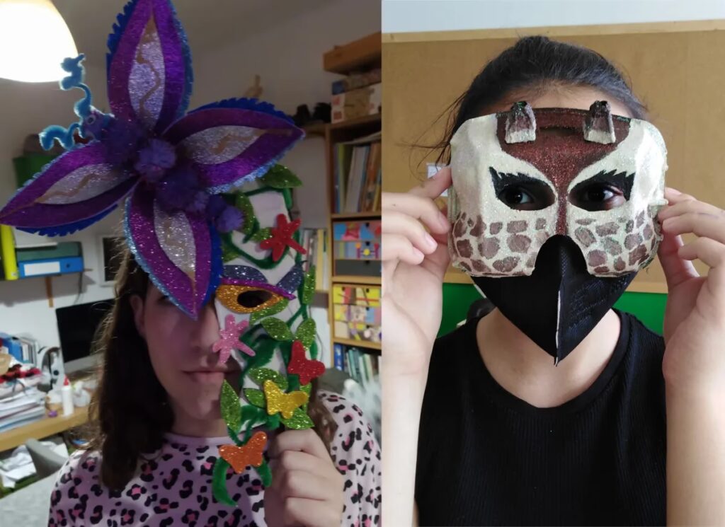 Una vez que la máscara esté completamente decorada y seca, haz dos pequeños agujeros a los lados, a la altura de las sienes, con un punzón o la punta de una tijera. Pasa una goma elástica por los agujeros y anúdala por dentro. ¡Lista para usar!