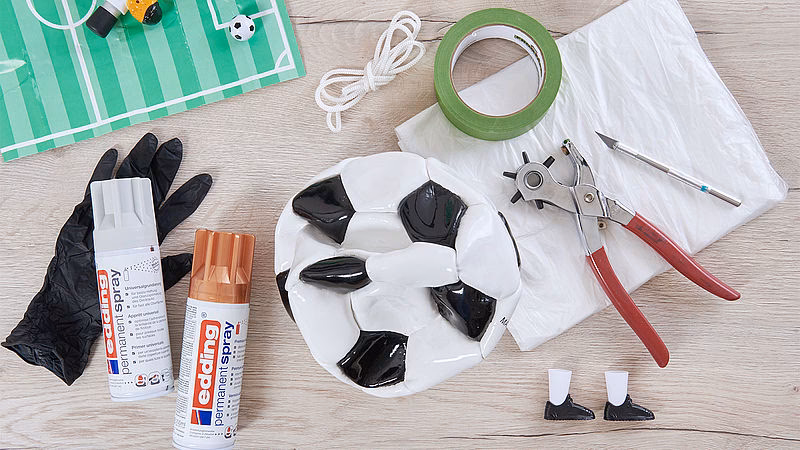 • Diseño clásico: Usa cinta adhesiva negra o un marcador permanente para dibujar los clásicos pentágonos y hexágonos de un balón de fútbol.