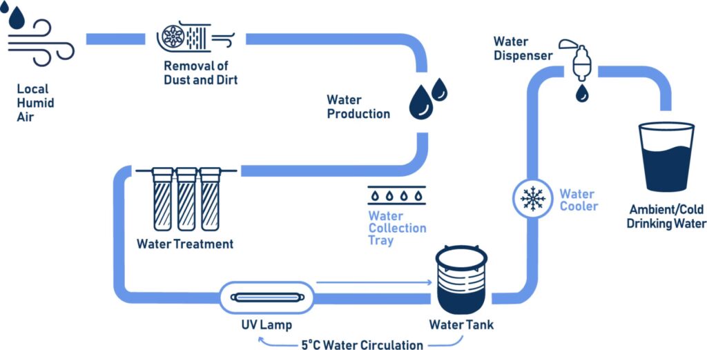 El proceso es relativamente sencillo: un ventilador introduce aire ambiente en la máquina, donde pasa sobre una serie de serpentines enfriados por un gas refrigerante. Al enfriarse el aire por debajo de su punto de rocío, el vapor de agua que contiene se condensa y se convierte en agua líquida. Esta agua recolectada, sin embargo, no está lista para beber de inmediato. Pasa por un complejo sistema de filtración para eliminar cualquier partícula o impureza, luego es esterilizada, a menudo con luz ultravioleta, para eliminar bacterias y virus. Finalmente, se le añaden minerales para mejorar su sabor y sus propiedades saludables, antes de ser almacenada en un tanque de grado alimenticio. Empresas como la sudafricana Water from Air y la india WaterMaker ofrecen dispositivos de diversos tamaños, desde fuentes de agua para el hogar que producen unos 30 litros al día hasta unidades del tamaño de un camión capaces de abastecer a comunidades enteras. La principal limitación de esta tecnología es su dependencia de la humedad relativa; su rendimiento óptimo se alcanza por encima del 60%, lo que la hace ideal para climas tropicales pero menos eficiente en regiones áridas.