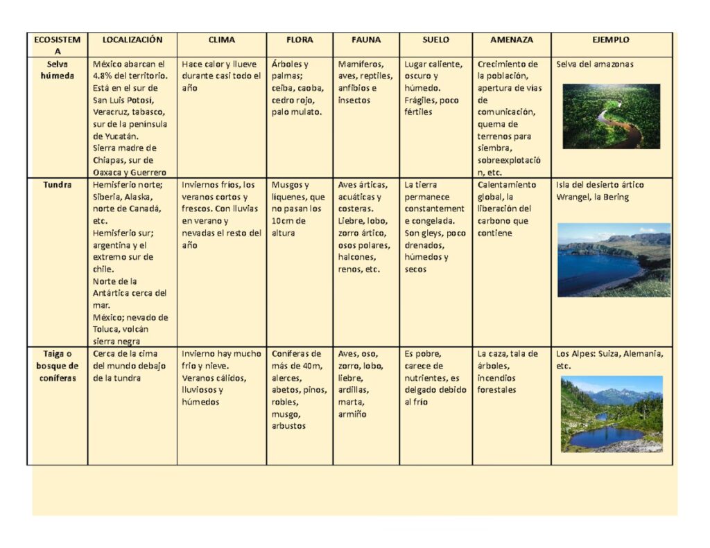 | Característica | Manglar | Bosque Seco Tropical | Bosque Húmedo Tropical |