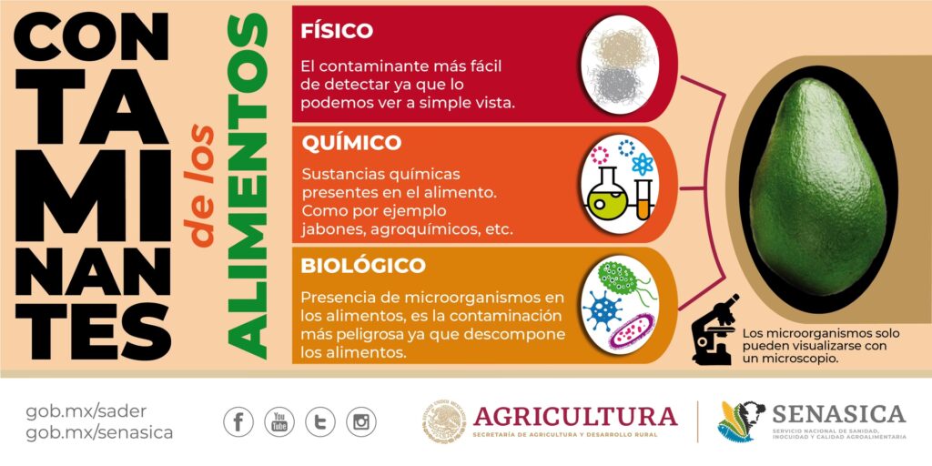 - Contaminación Química: Ocurre cuando los alimentos entran en contacto con sustancias químicas tóxicas, como pesticidas, productos de limpieza, metales pesados o aditivos no autorizados.