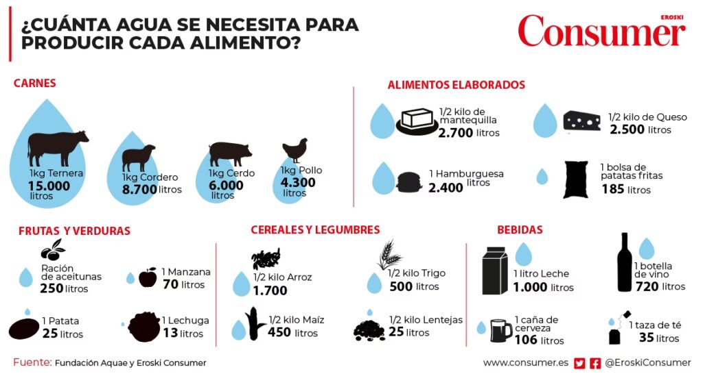 - No exactamente. La cifra de 15,000 litros representa la huella hídrica total, pero más del 90% de esa agua es "agua verde" (lluvia), que forma parte del ciclo natural. El consumo directo de agua dulce de ríos y acuíferos (agua azul) es mucho menor, aunque sigue siendo significativo, situándose en torno a los 550-700 litros.