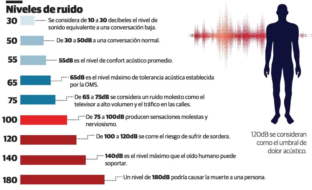 | Despegue de un avión o disparo | 130 - 140 dB | Dolor y daño auditivo permanente instantáneo |