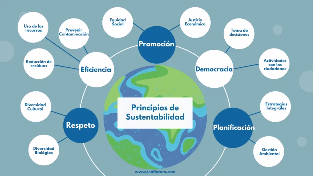 - Gestión eficiente de recursos: Utilizar recursos como el agua, la energía y los minerales de forma que se minimice el desperdicio y se asegure su disponibilidad para el futuro.