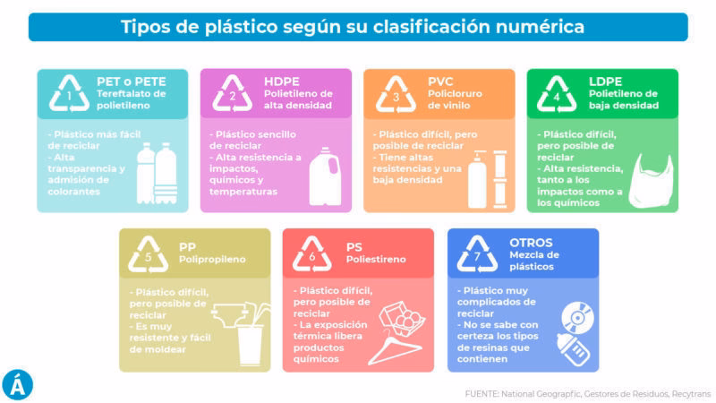 | 1 | PET | Botellas de agua y refrescos, envases de comida. | Alto (ampliamente reciclado). |