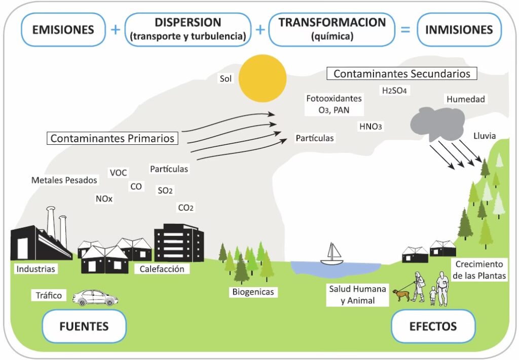 - Inmisión: Es la concentración de contaminantes presente en el aire en un lugar y momento determinados, una vez que estos se han dispersado, transportado y mezclado. Es lo que realmente respiramos y a lo que estamos expuestos.