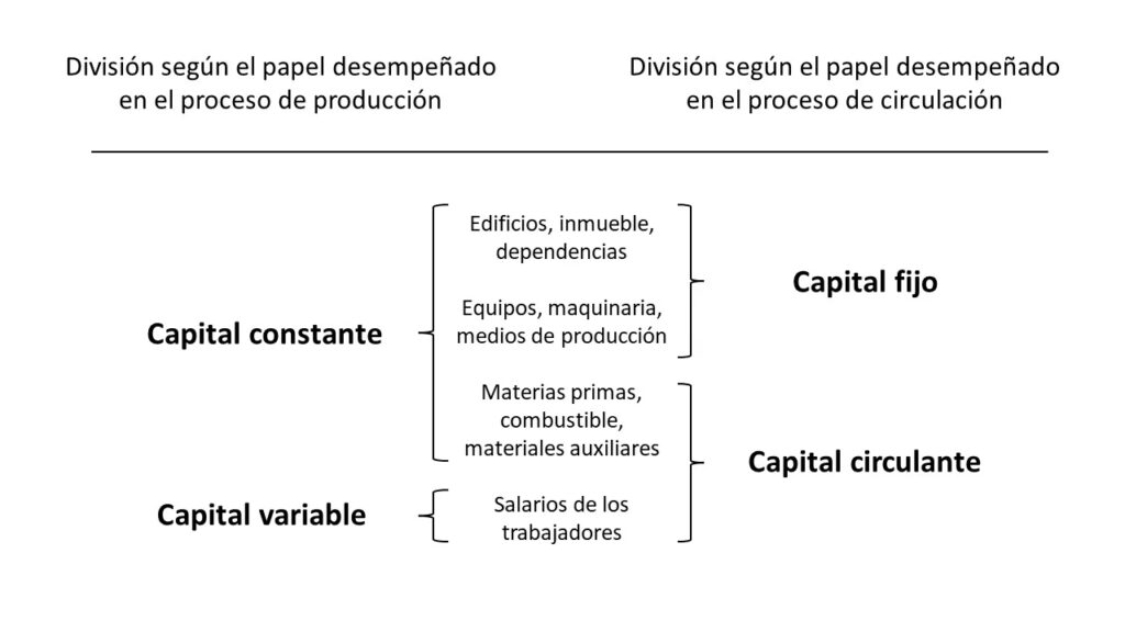 La economía convencional suele distinguir entre capital fijo (maquinaria, edificios) y capital circulante (materias primas, salarios). Marx argumentó que esta distinción es superficial porque solo describe la velocidad con que el valor de cada elemento se transfiere al producto final. En cambio, la distinción entre capital constante (medios de producción) y capital variable (fuerza de trabajo) es decisiva porque revela el secreto de la ganancia. Muestra que solo una parte del capital, la invertida en trabajadores, es la que genera nuevo valor y plusvalía, mientras que el resto solo transfiere su propio valor. Ocultar esta distinción es ocultar la naturaleza explotadora de la relación capitalista.