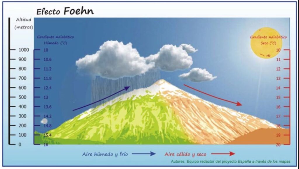 - El descenso de aire en la ladera de una montaña (sotavento), lo que provoca un calentamiento significativo.