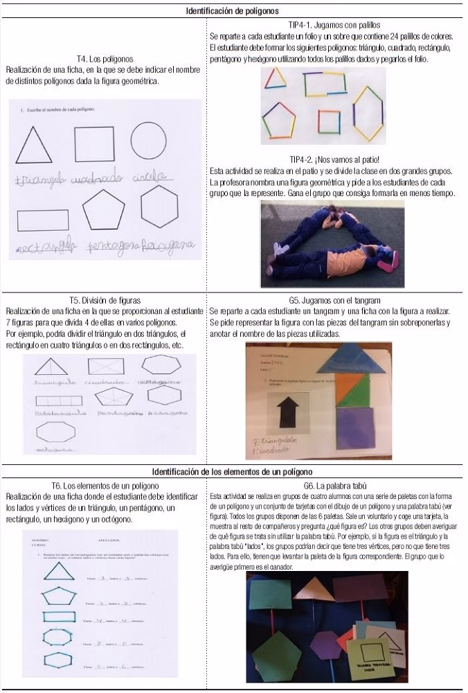 | Recursos | Libros de texto, reglas, compases, bloques de plástico. | Hojas, piedras, conchas, ramas, flores, patrones en el suelo. |
