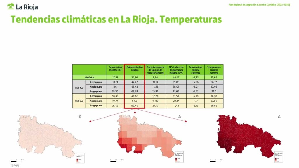Las proyecciones climáticas indican un aumento generalizado de las temperaturas medias. Para La Rioja, esto se traduce en veranos aún más tórridos y en una mayor frecuencia e intensidad de las olas de calor. Este calentamiento intensifica la evaporación del agua, seca los suelos y aumenta el riesgo de incendios forestales en las zonas de sierra. Los ecosistemas naturales y los cultivos se enfrentan a un estrés térmico sin precedentes.