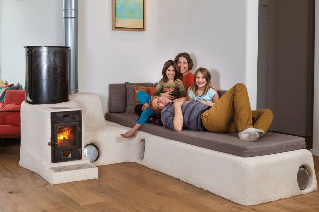 Una vez que los gases han completado su combustión en el Riser, en lugar de salir directamente al exterior, son forzados a recorrer un largo conducto horizontal que atraviesa una gran masa construida con materiales densos como ladrillos, adobe, piedra o barro. Esta masa actúa como una batería térmica, absorbiendo el calor de los gases antes de que estos salgan por la chimenea a una temperatura mucho más baja. El calor acumulado en esta masa (que a menudo se diseña como un banco, un sofá de obra o incluso una cama) se libera lentamente al ambiente durante horas, e incluso días, a través de calor radiante.