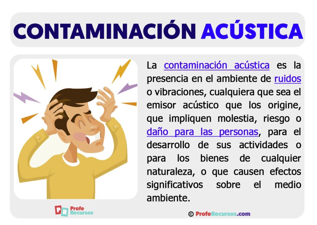 La contaminación acústica se define como la presencia en el ambiente de ruidos o vibraciones, cualquiera que sea el emisor acústico que los origine, que impliquen molestia, riesgo o daño para las personas, para el desarrollo de sus actividades o para los bienes de cualquier naturaleza, o que causen efectos significativos sobre el medio ambiente. En términos más sencillos, es el ruido excesivo que perturba nuestro entorno.