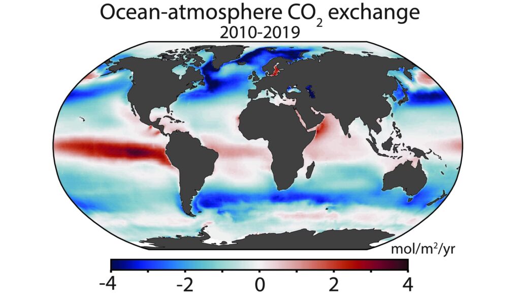 La absorción de CO2 por los océanos tiene un grave efecto secundario: la acidificación marina. Al disolverse en el agua, el CO2 forma ácido carbónico, lo que reduce el pH del océano, haciéndolo más ácido. Desde la era preindustrial, el pH de la superficie oceánica ya ha disminuido. Esta acidificación amenaza la vida marina, especialmente a organismos como los corales, los moluscos y ciertos tipos de plancton que necesitan carbonato para construir sus conchas y esqueletos. La degradación de estos organismos pone en riesgo toda la cadena trófica marina.