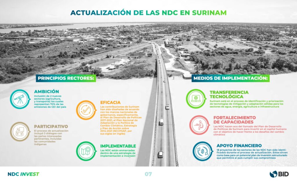 Se estima que la implementación del plan de Surinam costará 696 millones de dólares. Como país en desarrollo, Surinam espera recibir apoyo financiero de los países desarrollados y del sector privado internacional, en línea con los principios de responsabilidad compartida y financiamiento climático establecidos en el Acuerdo de París.