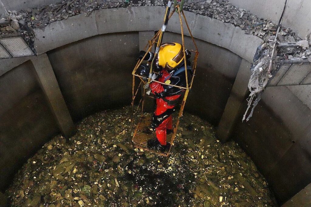 La misión no termina al salir del agua. La fase de descontaminación es tan crítica como la propia inmersión. Se establece una "zona caliente" alrededor del punto de salida, donde el buzo es rociado con soluciones desinfectantes por un equipo de apoyo antes de comenzar a quitarse el equipo. Este proceso se realiza siguiendo un orden estricto para evitar el contacto de la piel limpia con el equipo contaminado. Una vez descontaminado y fuera del traje, el buzo debe ducharse a fondo.