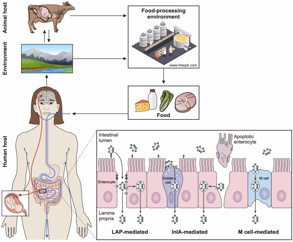 Una vez que ha cruzado la barrera intestinal y ha accedido a los tejidos más profundos y al sistema linfático, la listeria puede entrar en el torrente sanguíneo, provocando una bacteriemia. Desde allí, puede viajar a cualquier parte del cuerpo. Sin embargo, muestra una afinidad particular por dos localizaciones: el sistema nervioso central (SNC) y la placenta en mujeres embarazadas.