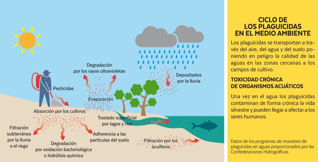 Tras la aplicación, la lluvia o el riego arrastran los plaguicidas desde los campos hacia ríos, lagos y arroyos. Este escurrimiento superficial es una fuente directa de envenenamiento para la vida acuática, causando la muerte masiva de peces y otros organismos. Además, los químicos pueden filtrarse (lixiviarse) a través del suelo hasta alcanzar las aguas subterráneas, que son una fuente crucial de agua potable para millones de personas. Una vez en el agua, muchos de estos compuestos son resistentes a la degradación, persistiendo durante años y bioacumulándose en la cadena alimentaria acuática.