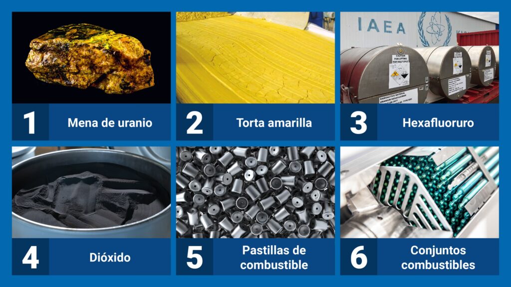Comienza como un mineral que contiene el metal uranio, pero para su uso en la mayoría de los reactores se procesa hasta convertirlo en un material cerámico (dióxido de uranio, UO₂). Por tanto, el combustible en sí son pastillas cerámicas contenidas dentro de tubos metálicos.