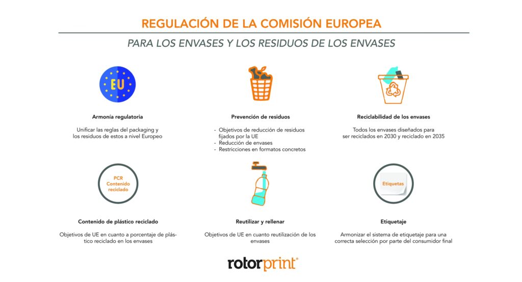 El diseño también se regula: se establece un ratio máximo de espacio vacío del 50% para envases colectivos y de comercio electrónico, y se fijan objetivos de contenido mínimo de material reciclado en los envases de plástico para 2030 y 2040.