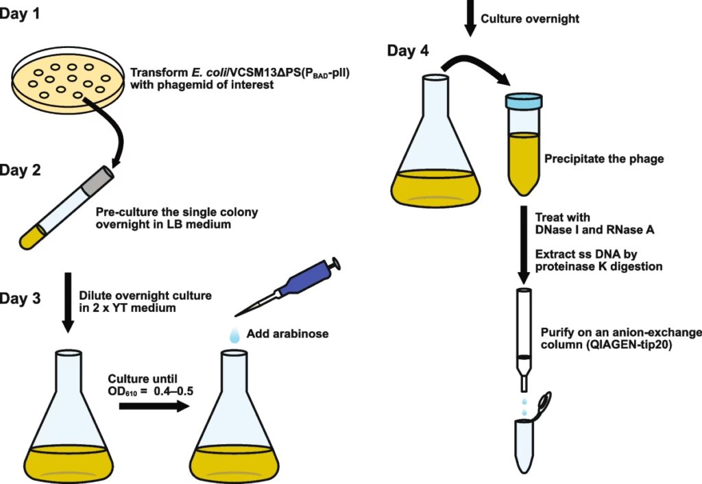 - Uso de Plásmidos Auxiliares: Este enfoque biológico utiliza bacterias, pero requiere la introducción de dos piezas de ADN distintas: el fagemido (que contiene el ssDNA deseado) y un plásmido "auxiliar" (que proporciona la maquinaria para producirlo). El problema es que este sistema es inconsistente, a menudo produce contaminantes no deseados y el producto final tiene una pureza baja, requiriendo pasos de purificación adicionales y costosos.