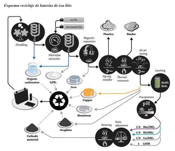 El proceso es similar al de las pilas estándar en sus primeras fases: trituración controlada para evitar incendios (las baterías de litio pueden ser inestables), seguida de separación mecánica y magnética para aislar plásticos, aluminio, cobre y acero. El polvo resultante, conocido como "black mass", es la parte más valiosa. Se somete a complejos procesos hidrometalúrgicos para recuperar sales de litio, cobalto, níquel y otros metales de alto valor que se usarán para fabricar nuevas baterías, cerrando así el ciclo.