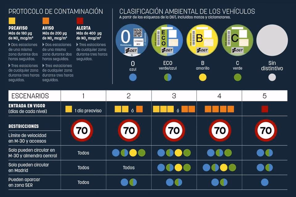 La legislación establece un valor límite horario de 200 microgramos por metro cúbico (µg/m³) que no debe superarse. Cuando las condiciones meteorológicas, como la estabilidad atmosférica y la ausencia de viento, impiden la dispersión de los contaminantes, las concentraciones de NO₂ pueden dispararse, activando el "Protocolo de medidas a adoptar durante episodios de contaminación por dióxido de nitrógeno". Este protocolo establece una serie de escenarios con medidas progresivas, que pueden ir desde la limitación de la velocidad a 70 km/h en la M-30 y accesos, hasta la prohibición de circular a ciertos vehículos en el interior de la almendra central.