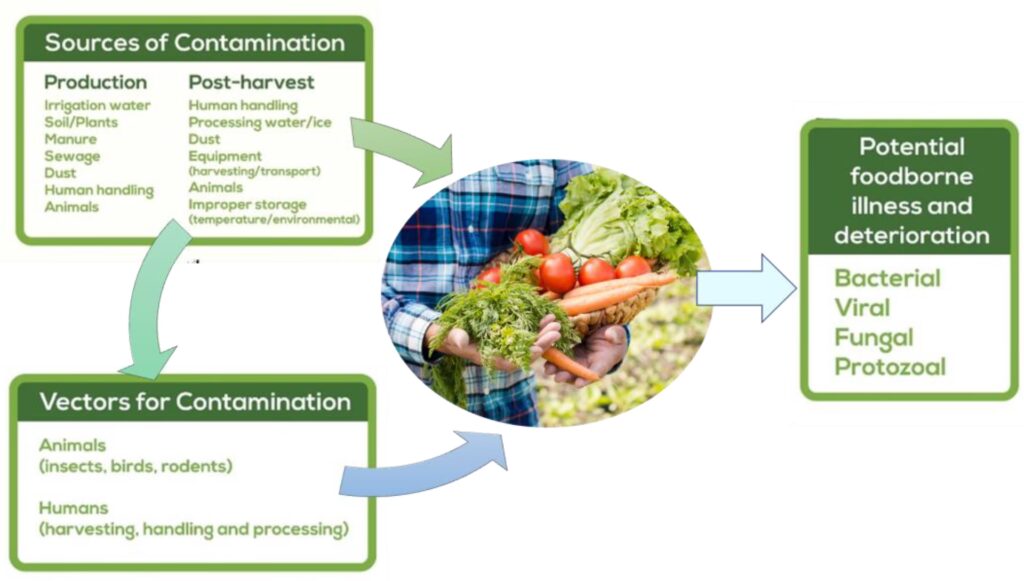 Las frutas y verduras frescas pueden contaminarse con microorganismos desde diversas fuentes a lo largo de toda su cadena de producción, desde el campo hasta nuestra mesa. Estos puntos de contaminación se pueden agrupar en tres categorías principales: el suelo, el agua y la manipulación.