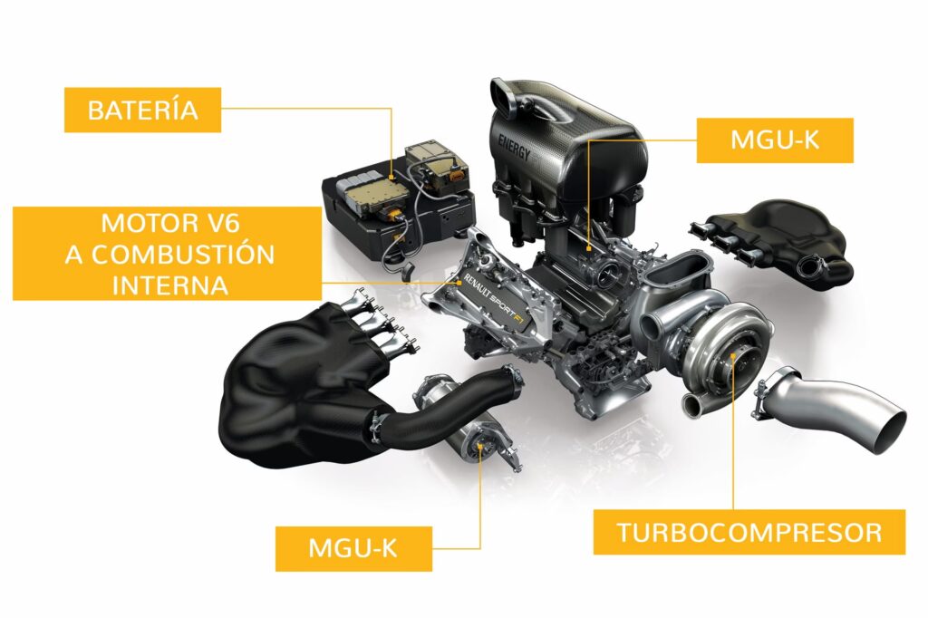 - Motor Generator Unit - Kinetic (MGU-K): Recupera energía cinética durante el frenado, como en los coches híbridos convencionales.