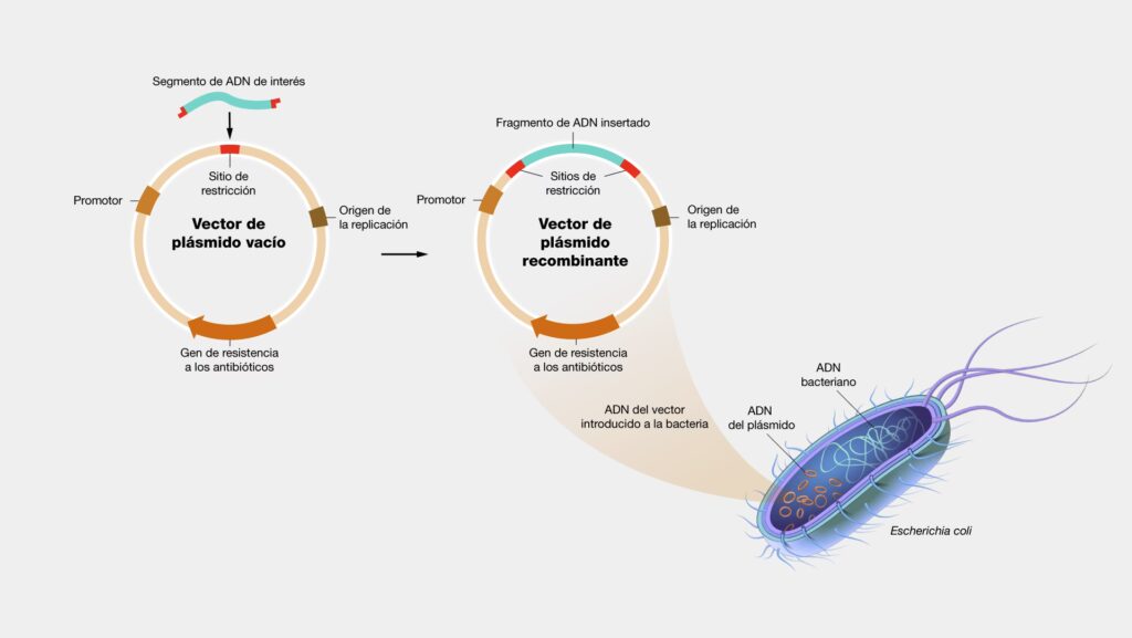 El primer paso es construir la herramienta que llevará el gen de interés a la nueva célula. A esta herramienta se le llama vector recombinante. Un vector es, esencialmente, una molécula de ADN (a menudo un plásmido, que es una pequeña molécula de ADN circular de las bacterias) que actúa como un vehículo de transporte.