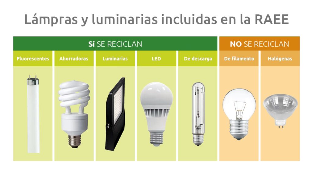 - Luminarias: Se refiere a las lámparas o dispositivos donde la bombilla viene integrada y no se puede separar. Al ser un aparato electrónico completo, debe ser gestionado como un RAEE en el punto limpio.
