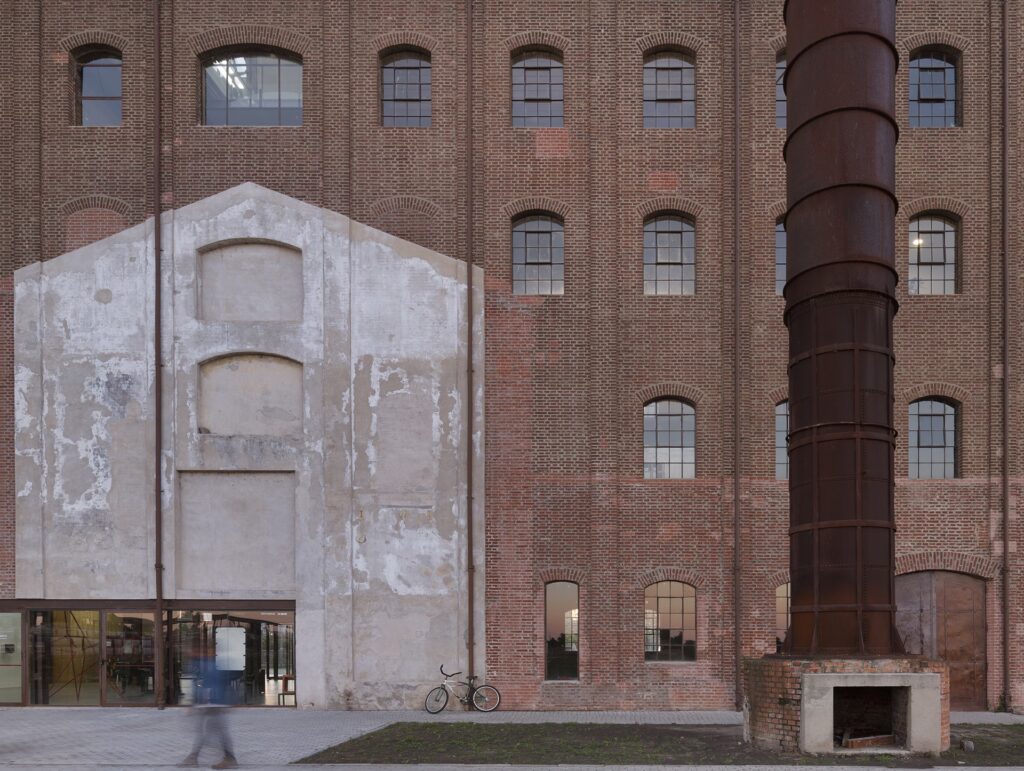 - Materialidad y Luz: Se recuperó la mampostería original, dejando los ladrillos a la vista tanto en el interior como en el exterior. En los antiguos silos de grano, se realizaron perforaciones estratégicas (cribados de mampuestos) para permitir la entrada de luz y ventilación, creando aulas únicas sin perder la pureza cilíndrica de los volúmenes exteriores.