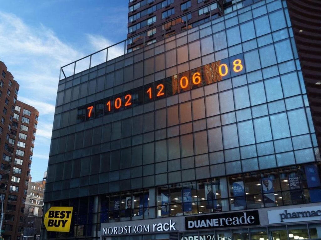 La transformación fue una iniciativa de los artistas y activistas Gan Golan y Andrew Boyd. El sábado 19 de septiembre de 2020, la pantalla del reloj comenzó a parpadear con un mensaje inequívoco: “La Tierra tiene una fecha límite”. Acto seguido, apareció una secuencia de números: 7 años, 103 días, 15 horas, 40 minutos y 7 segundos. No era una hora aleatoria, sino el cálculo preciso, basado en datos del Instituto de Investigación Mercator sobre Bienes Comunes Globales y Cambio Climático de Berlín, del tiempo que le quedaba al mundo, con las tasas de emisión de ese momento, para agotar su "presupuesto de carbono" y hacer casi imposible limitar el calentamiento global a 1,5 °C por encima de los niveles preindustriales.