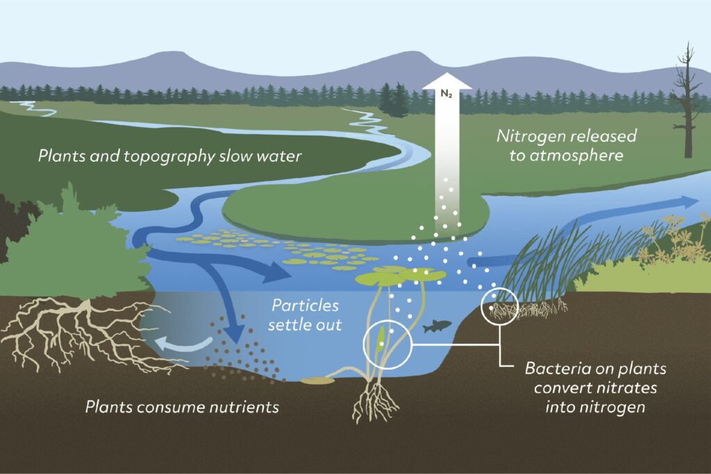 Consiste en crear franjas de vegetación permanente (hierbas, arbustos, árboles) entre los campos de cultivo y las masas de agua (ríos, arroyos, lagos). Estas barreras naturales actúan como un filtro, interceptando la escorrentía superficial, ralentizando el flujo del agua y permitiendo que las plantas absorban los nutrientes disueltos antes de que lleguen al ecosistema acuático.