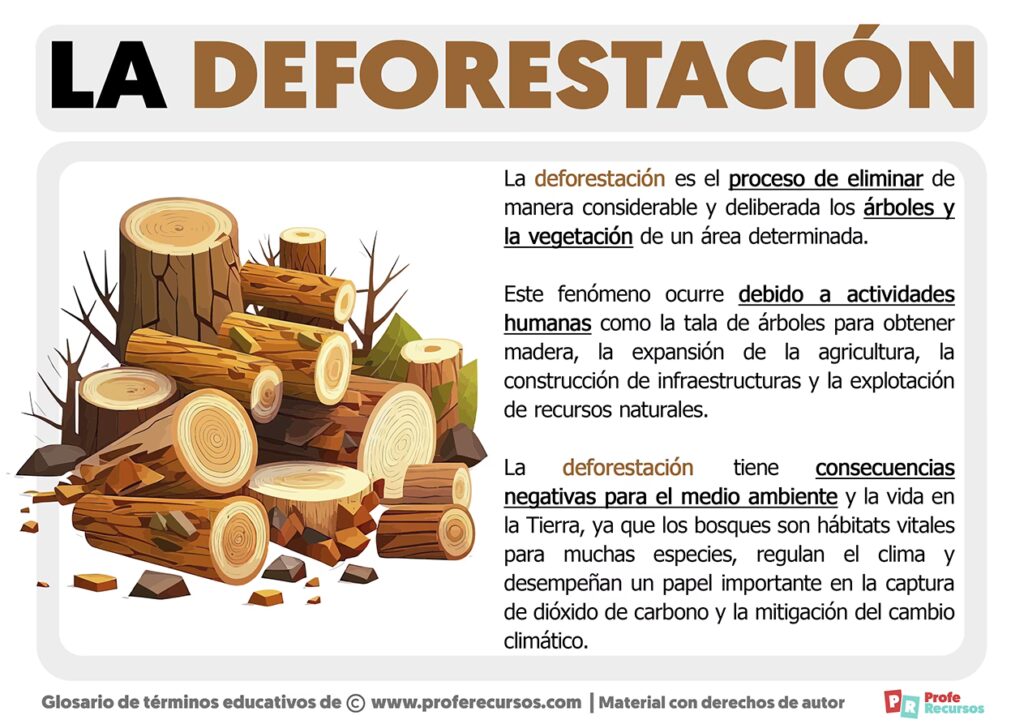 Es la eliminación a gran escala y permanente de bosques y selvas para destinar la tierra a otros usos, como la agricultura, la ganadería o la urbanización. Es una de las principales causas de pérdida de biodiversidad y del cambio climatico.