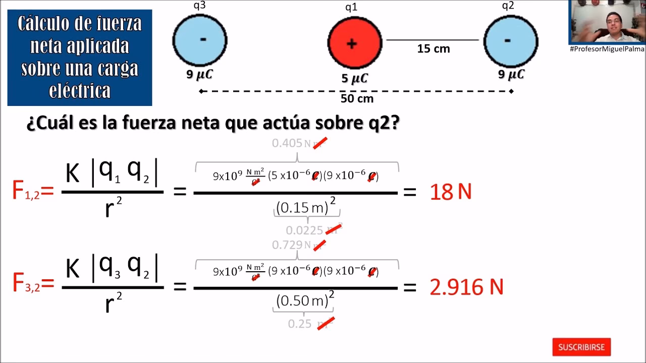 Conclusión: La magnitud de cada carga es 1 × 10⁻⁶ C (o 1 microcoulomb, µC). Como la fuerza es de repulsión, ambas cargas deben tener el mismo signo. Por lo tanto, las cargas son q₁ = +1 µC y q₂ = +1 µC, o q₁ = -1 µC y q₂ = -1 µC.