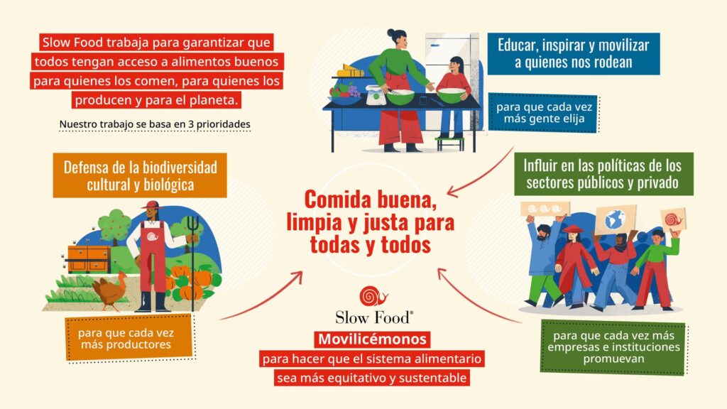 - Bueno: Se refiere a la calidad de los alimentos desde una perspectiva sensorial y saludable. Un alimento "bueno" es sabroso, fresco, de temporada y nutre nuestro cuerpo. Despierta nuestros sentidos y nos conecta con el placer de comer, respetando la cultura de la que proviene.