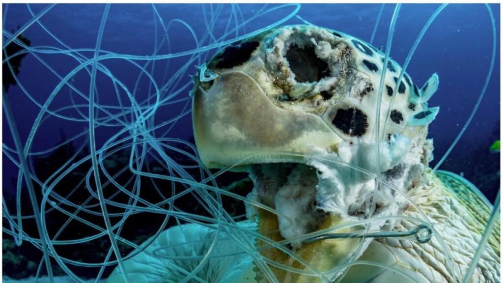 Las redes fantasma, que son redes de pesca perdidas o abandonadas en el mar, son una de las mayores causas de mortalidad. Las tortugas quedan atrapadas en ellas y, al no poder subir a la superficie para respirar, mueren ahogadas. Otros desechos como aros de plástico, cuerdas y envoltorios también pueden enredarse en sus aletas o cuello. A medida que la tortuga crece, el plástico se incrusta en su carne, causando heridas profundas, infecciones, amputaciones y, en muchos casos, impidiendo su capacidad para nadar y alimentarse.